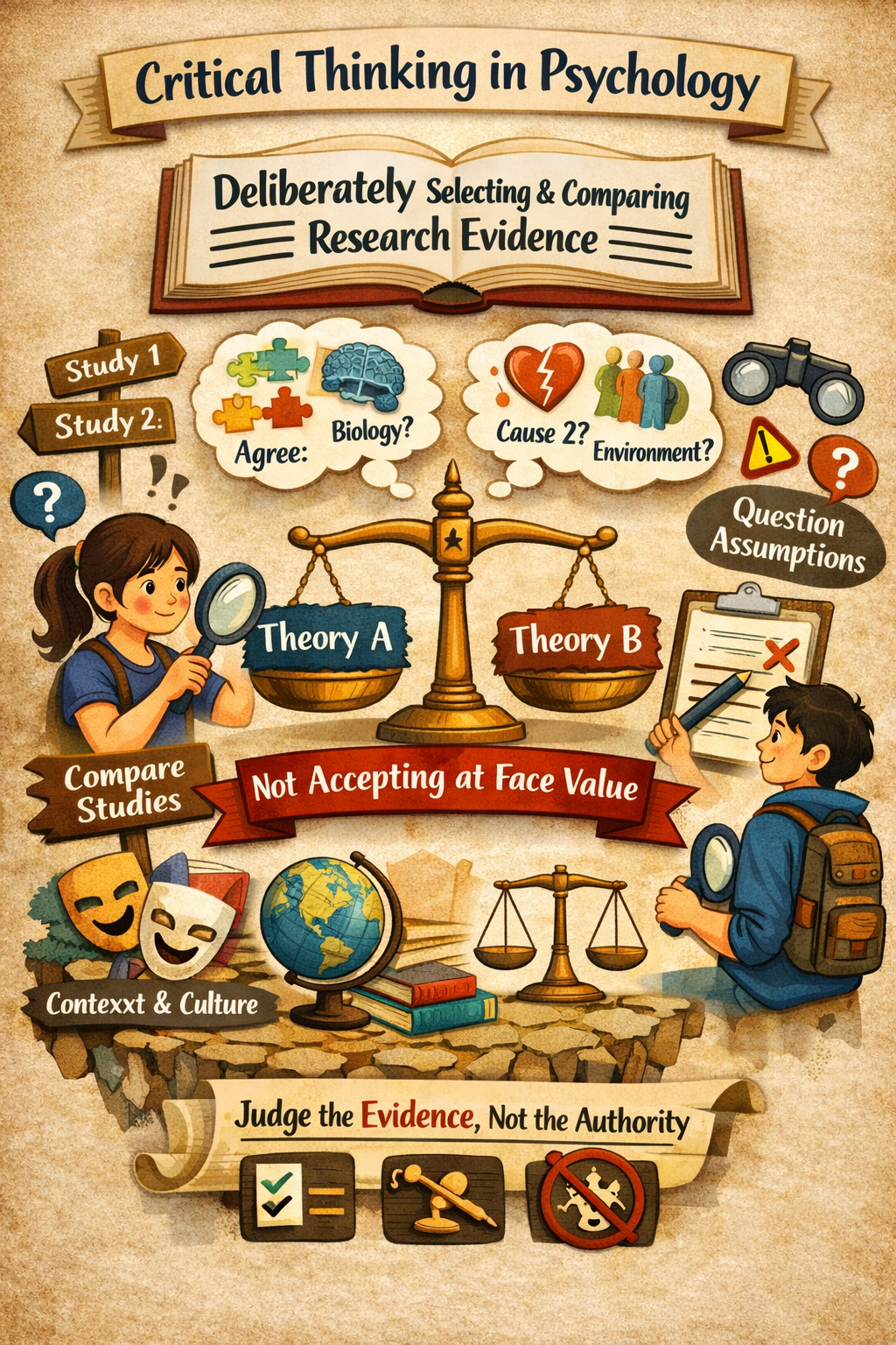 8. Theoretical framework Critical thinking requires understanding how research fits within broader psychological theories. Students should evaluate whether the theory adequately explains the findings, whether alternative theories exist, and how well the evidence supports the theoretical claims.